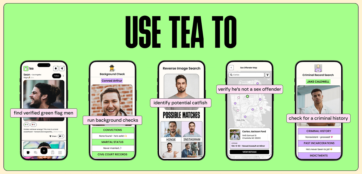 summarizes the problem with the app perfectly:“Some fear of embarrassment, or even fear in general, is warranted. What’s most insidious about Tea is that it banks on this without differentiation. Men who hit women are posted alongside guys who went through a shitty breakup with their high school girlfriend a decade ago, or guys who have yet to even be accused of having any “red flags.” Here again, a blanket antagonism is being fostered, one that could potentially obfuscate the boundaries of actual bad behavior. We as women are not any safer for it.”